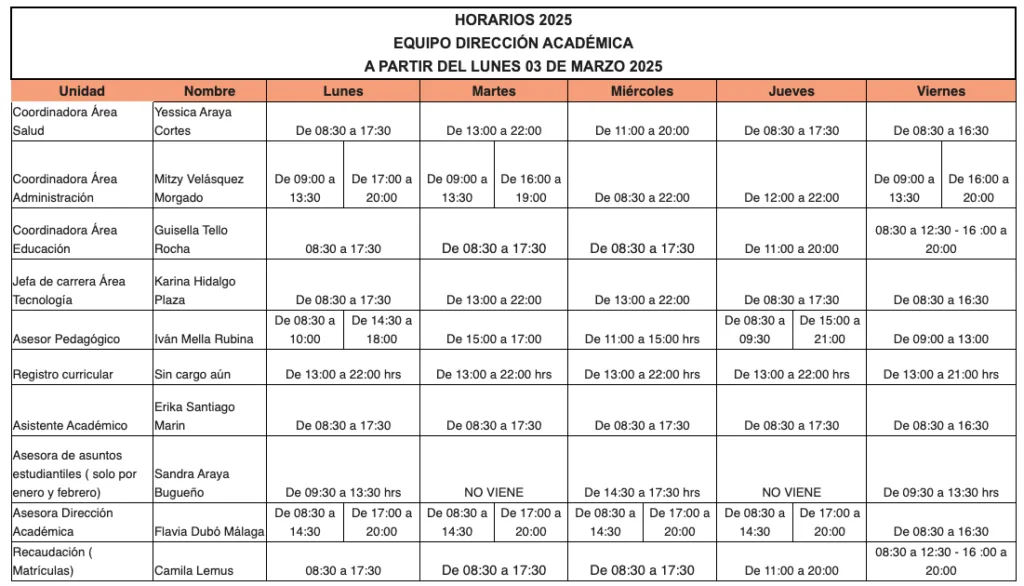 Asesora de Asuntos Estudiantiles (Becas y Beneficios) Sandra Araya Bugueño 09:30 – 13:30 hrs Sin atención 14:30 – 17:30 hrs Sin atención 09:30 – 13:30